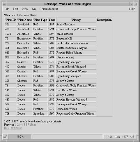 We develop the module step-by-step. We begin by developing support for multiple results pages, and the previous and next links. Later in this section, we add functionality to display page numbers as links that permit direct access to a chosen page. The output of the final version of the module when it is used to browse winestore regions is shown in Figure 5-8.